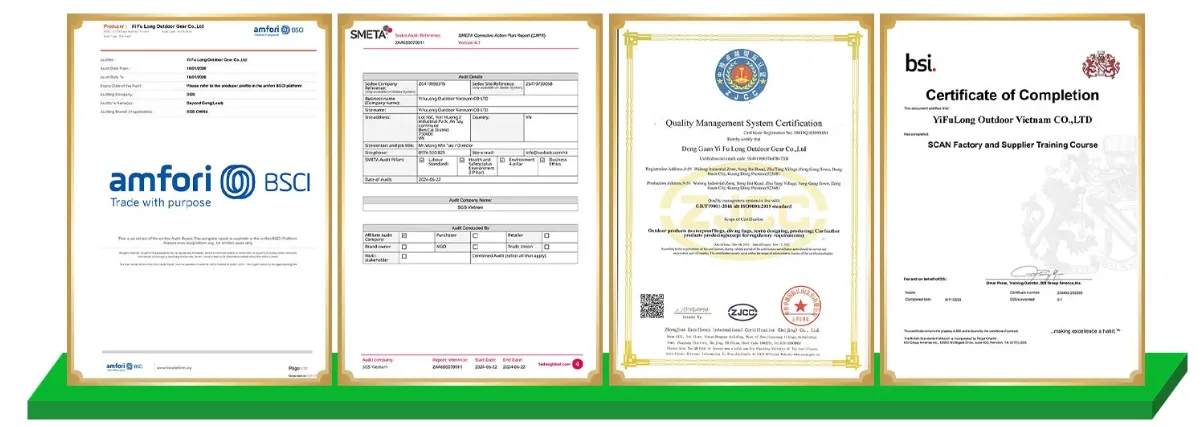 Tá roinnt deimhnithe údarásacha faighte againn i ndiaidh a chéile, lena n-áirítear ISO 9001 do bhainistiú cáilíochta, BSCI/SMETA maidir le freagracht shóisialta, agus Innéacs Higg le haghaidh inbhuanaitheachta comhshaoil.